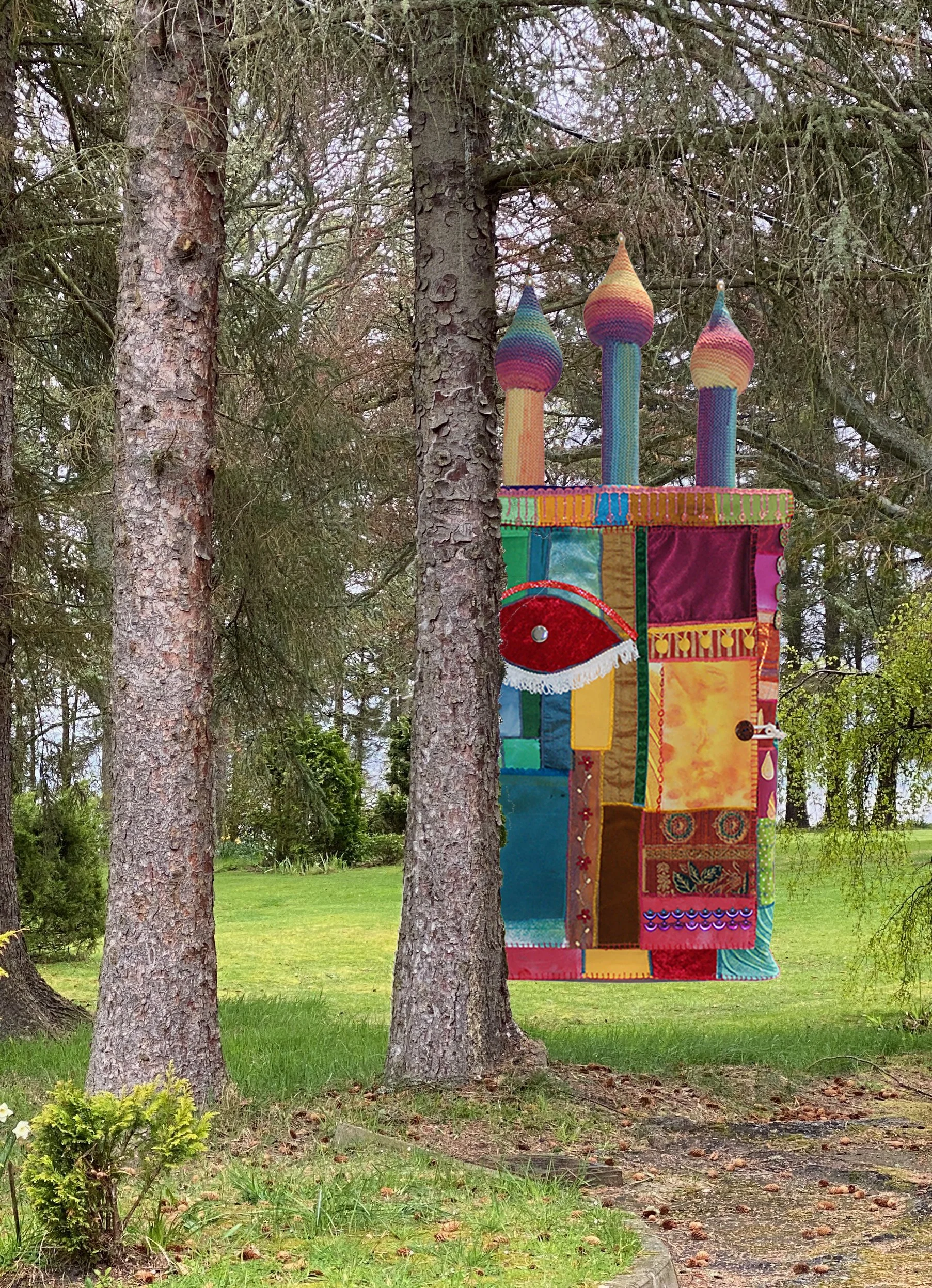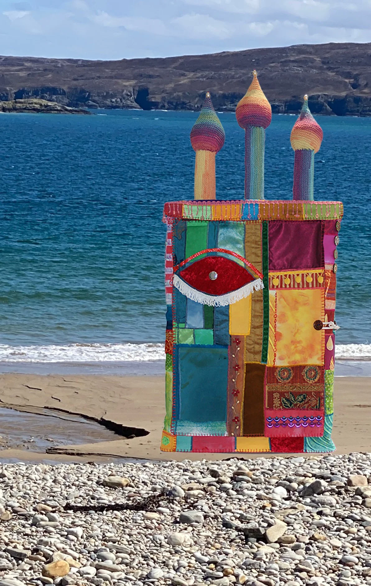 This work was created in response to the brief: “On Having an Outside”. As a child I often heard the phrase “children should be seen and not heard” and much of my inner life was quiet and not heard about by anyone. Inspired by the work of Nick Cave, who makes ‘sound suits’ donned by individuals who are then ‘heard and not seen’, I wondered what it would be like to reverse this idea. I made a flamboyant ‘suit’ for an old bathroom cabinet, which also took inspiration from Hundertwasser’s onion domes and windows, which make the piece appear like a building. The items inside represent the quiet and quietening of childhood pastimes. Later, I experimented with adding the sculpture to scenes I photographed in Scotland…