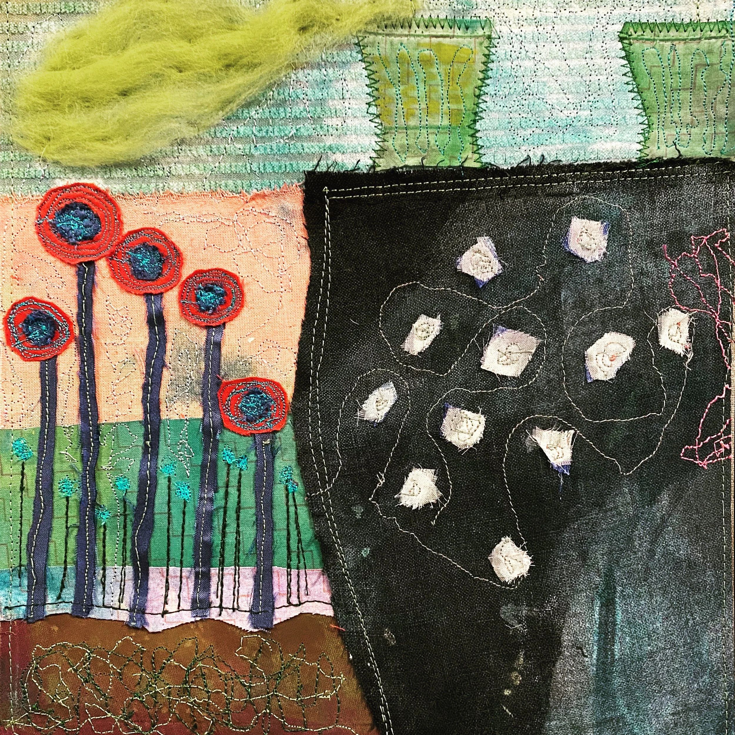 Poppies and Smoke Textile Collage, 202125 x 25cmRecycled fabric, acrylic paint, roving, machine stitching