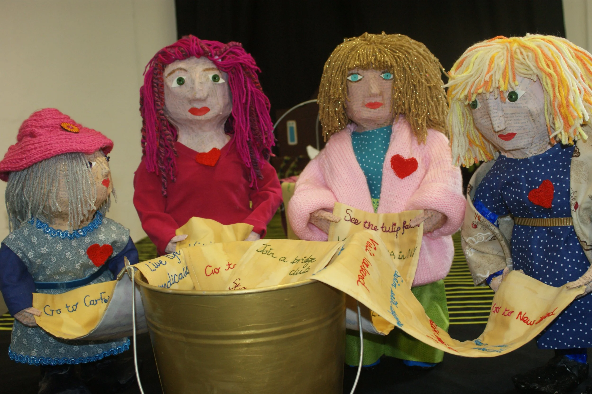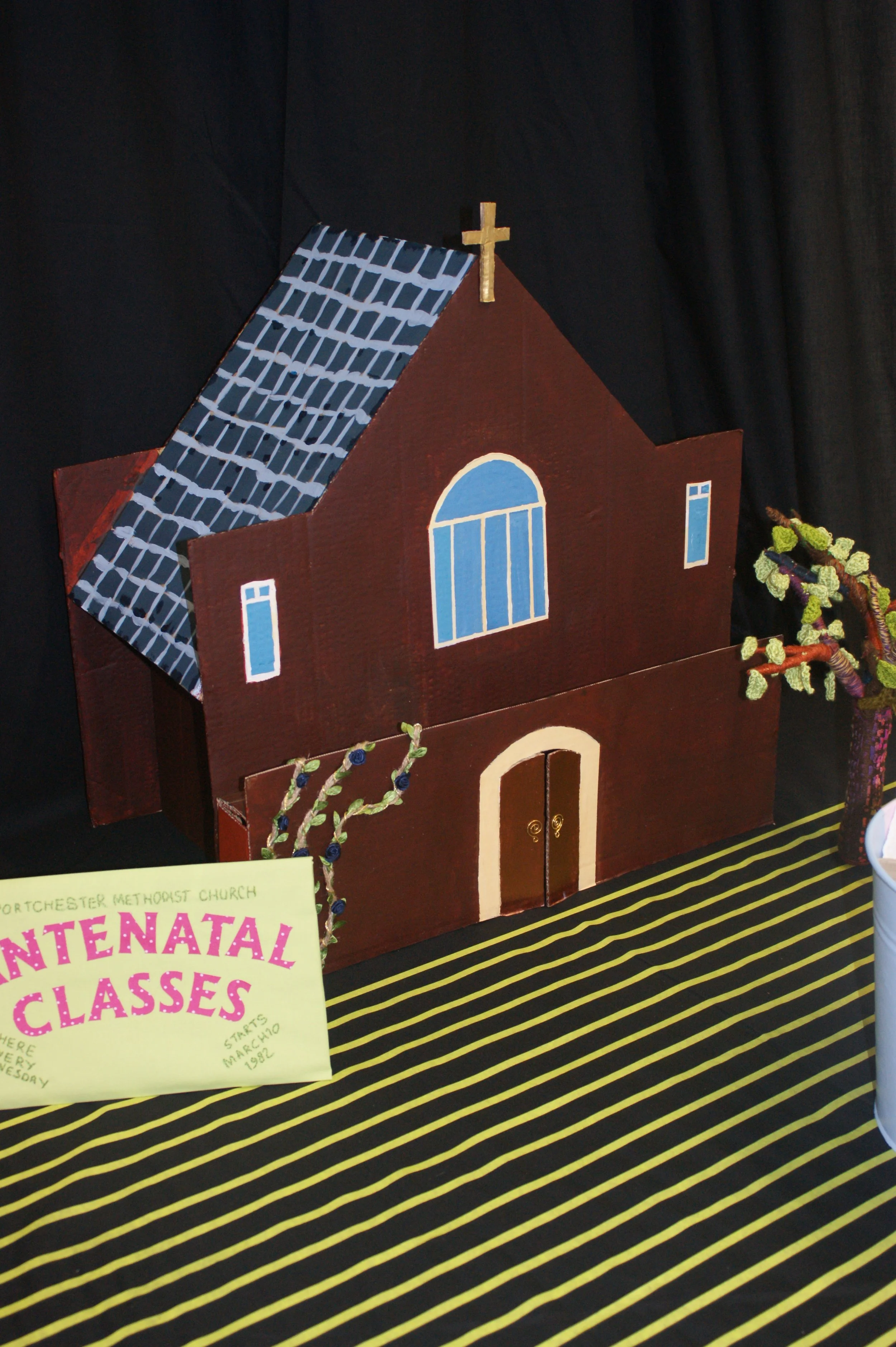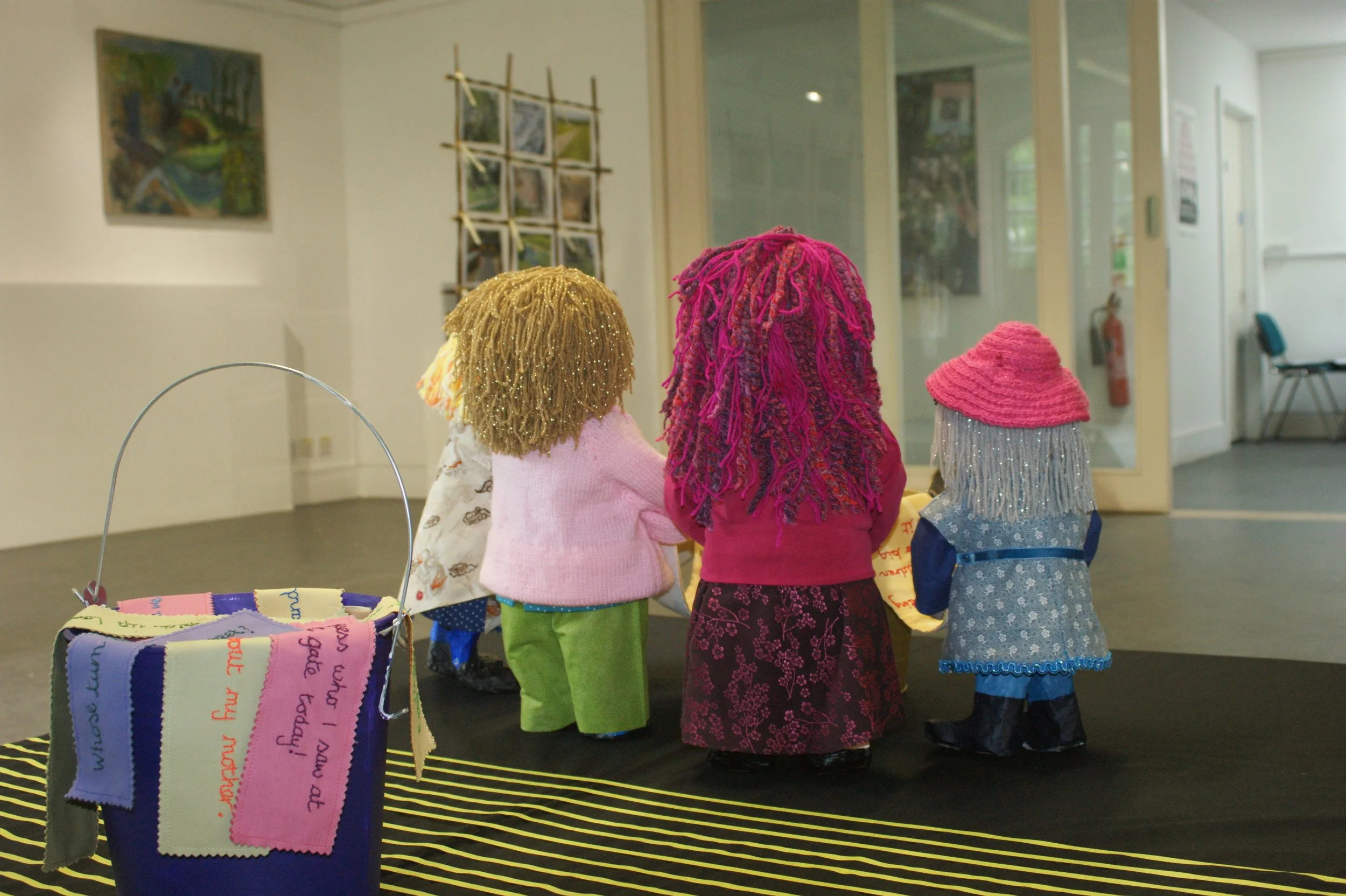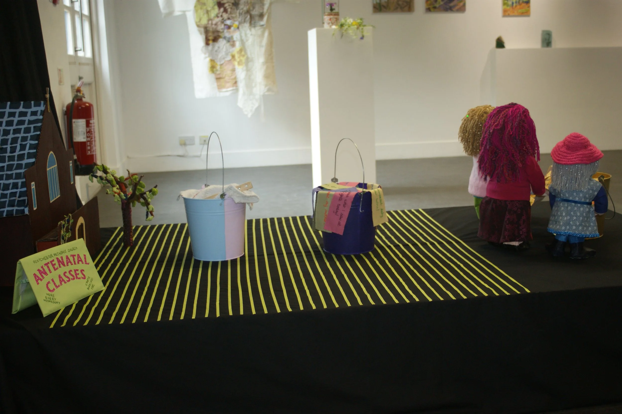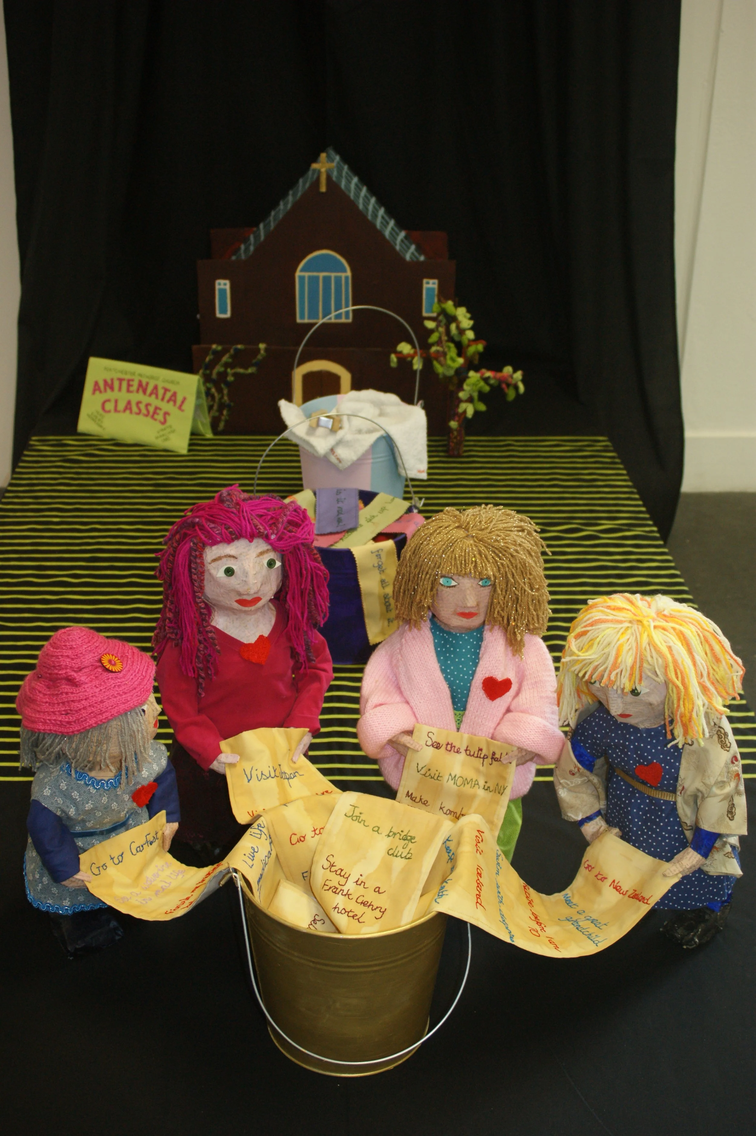 In 1982 I met three women - Bonnie, Rose and Linda - at antenatal classes held in our local church hall. Once the babies were born we decided to carry on meeting - first on Wednesday afternoons, and later in the evenings. We've met most Wednesdays ever since and still call it 'girls' night' even though we're now in our sixties. We made this piece of work together in 2024 to celebrate our 42-year-old friendship. The space between the church hall and the papier mache girls is marked by 42 lines and there is also a ‘bucket’ theme: a bucket full of nappies, a bucket full of problems and conversations we’ve shared over the years, and a golden bucket full of our bucket lists.